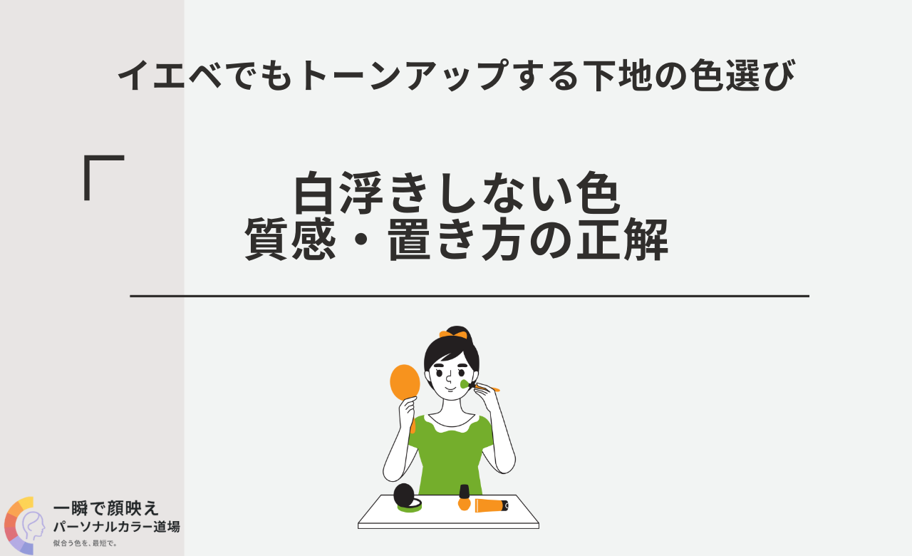 「明るくしたいのに白浮きする」「首だけ黄みが残って顔と分断」「ピンクを塗ると赤ら顔に見える」——。イエベが下地でトーンアップに失敗しやすいのは、色(明るさ/色み)、質感(つや/マット)、置き場所の3点が、首の色と光の拾い方に合っていないからです。