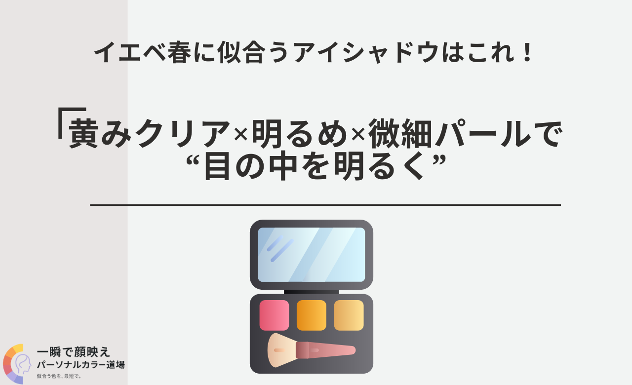 「ブラウンを塗ると一気にくすむ」「流行色が浮く」「ラメがギラつく」――イエベ春の目元迷子は、色の清濁(にごり)・明るさ・光の粒の大きさが合っていないサインです。