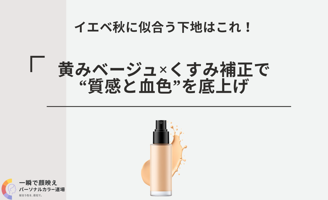イエベ秋の下地は、黄み〜ニュートラルのベージュ×首±0〜半段暗め×薄膜セミマットで“面”を整え、赤み/毛穴は点補正、艶は点と帯で後から足す――これが失敗しない最短ルート。