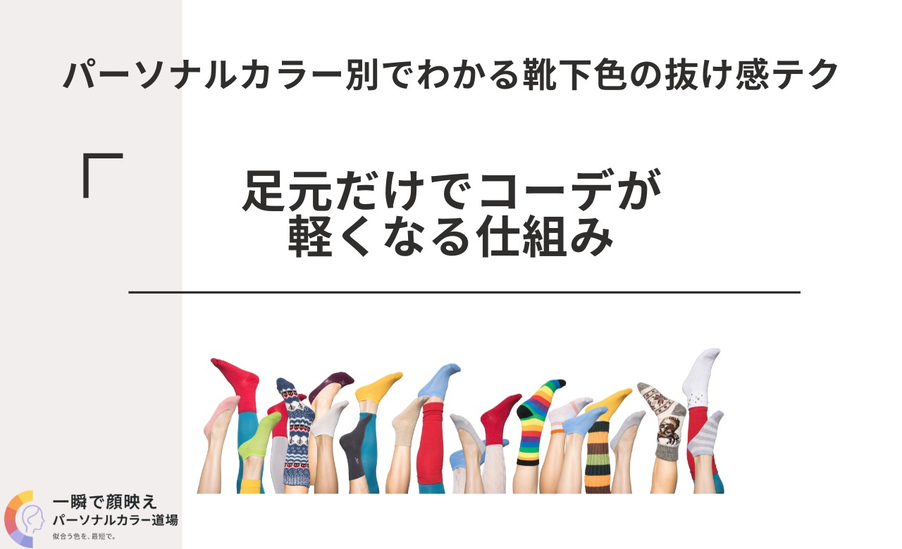 この記事では、足首という小さな場所がなぜここまで印象を左右するのかという仕組みをまず丁寧に説明し、そのうえでパーソナルカラー4タイプ別に**「ベースで常備しておきたい靴下色」「抜けやすくなる差し色」「重く見えやすく注意したい色・素材」を細かく整理します。