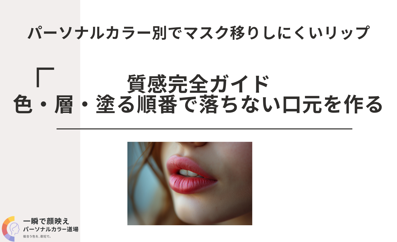 マスク移りを防ぐ基本は、自分のパーソナルカラーに沿った色を薄く・密に重ね、中央だけを光らせ、口角をマットで締めることです。色が合っていれば薄づきでも顔色は落ちず、そのぶん重ね塗りの必要がなくなるので、そもそもマスクに移る量が減ります。