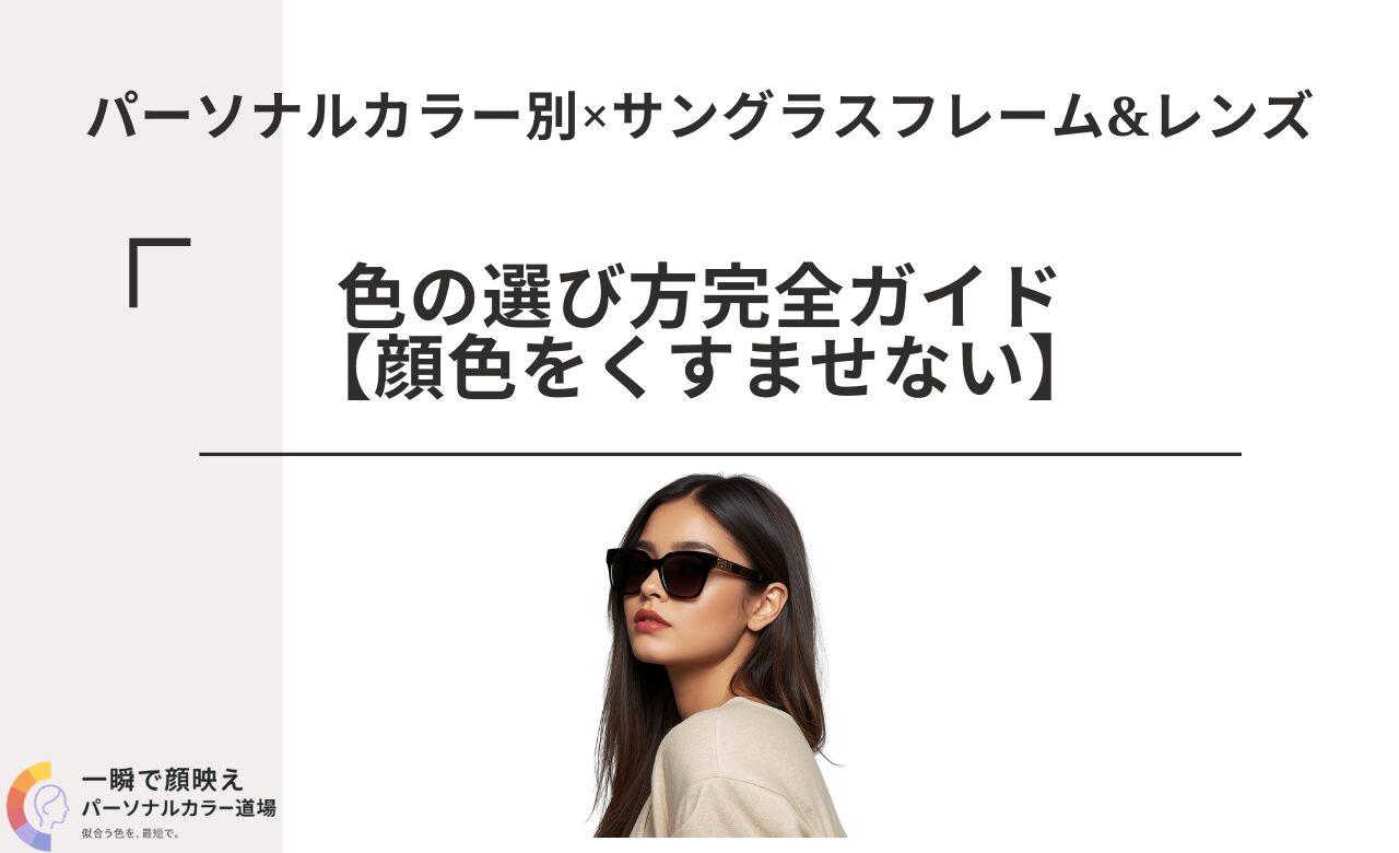 ①パーソナルカラーに合う肌なじみ系のフレーム色を先に決める ②フレームの温度と喧嘩しないレンズ色・濃さ・透け感を選ぶ ③出番が多いシーン(通勤・運転・旅行・海や山)ごとに透け感を1段階ずつ変える。この順番を守れば、黒縁が重い春タイプでも、ブラウンがくすみやすい夏タイプでも、グレーが冷えて見える秋タイプでも、ベージュがぼやっとする冬タイプでも、“似合うサングラス”を自分で割り出せます。