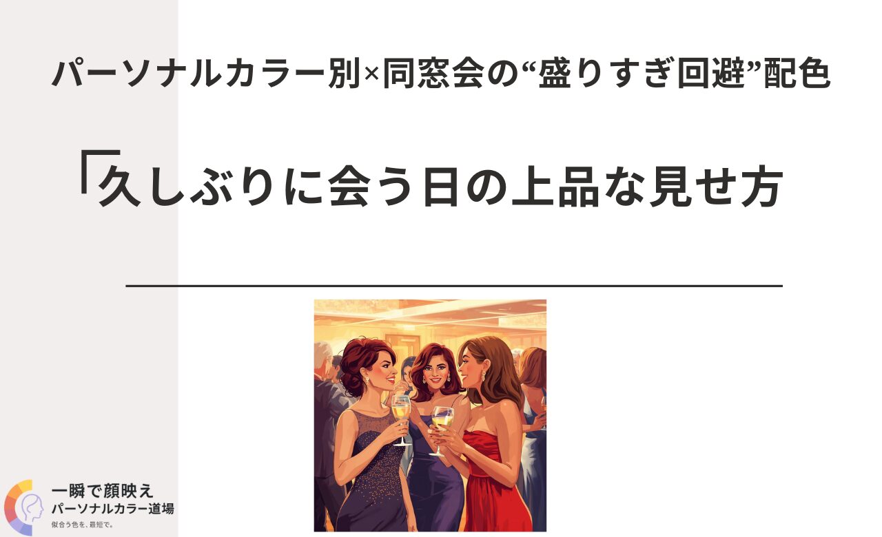 この記事では、まず“なぜ同窓会で色が暴走しやすいのか”を背景から整理し、次に4シーズン(イエベ春・ブルベ夏・イエベ秋・ブルベ冬)ごとに**「ここまでが盛れて見える上限」「ここから先は衣装感が出る」**を明確に線引きします。