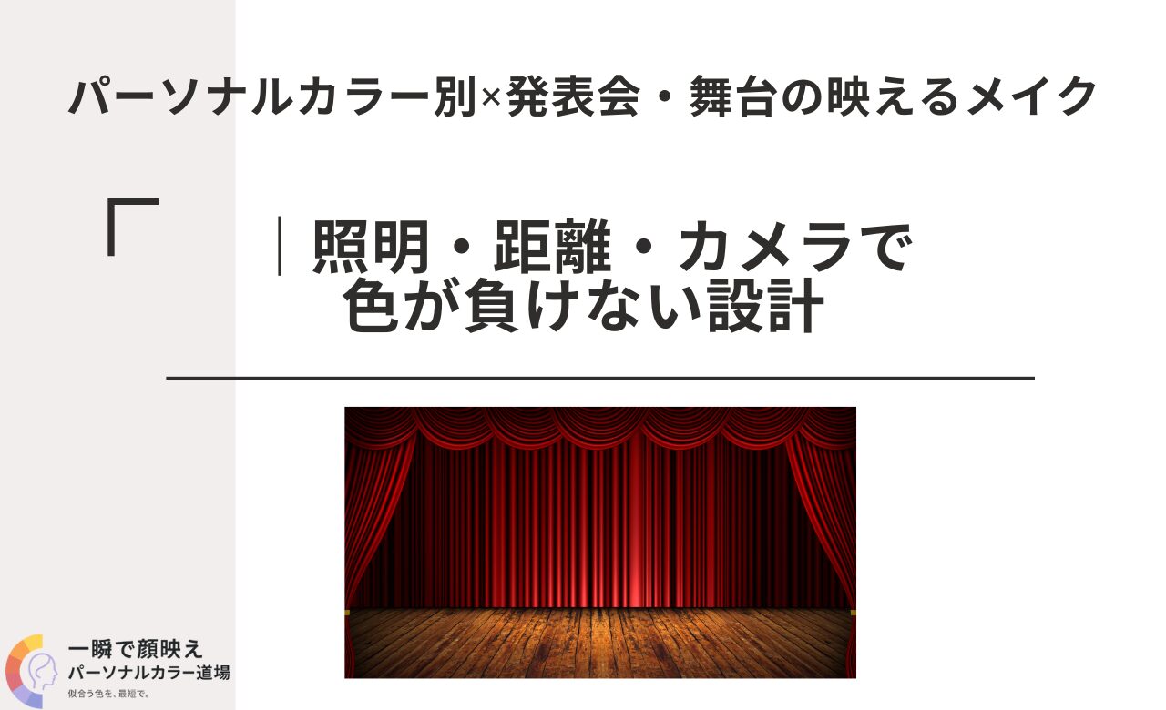 結論から言うと、①照明の色温度と方向を読む→②タイプ別にベース明度と頬・口の彩度を半段ずつ底上げ→③線(眉・ライン)と面(頬・ハイライト)の比率を距離で変える→④リハ・本番・写真での微修正ポイントを先に決めておく、この4段階を踏めば、春夏秋冬どのタイプでも、派手になり過ぎず、でも遠くからでも表情が見える舞台メイクが安定して再現できます。