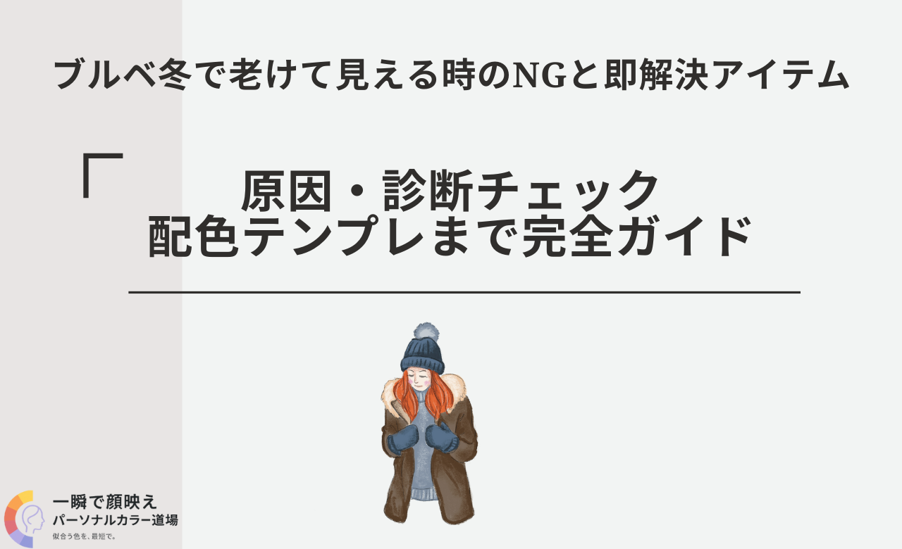 「黒で締めたはずが顔がきつく見える」「ボルドーを着ると老ける」「白ニットなのにくすむ」——ブルベ冬の“老け見え”は、明度(明るさ)・清さ(濁りの少なさ)・コントラストの三つが半歩ズレた時に起きます。