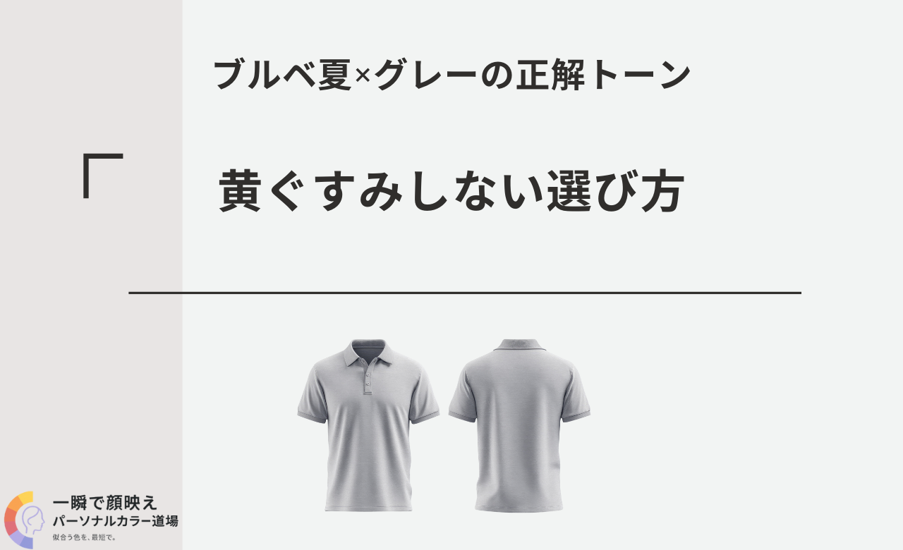 ブルベ夏のグレーは、明るめ〜中明度×クール寄り×なめらかな面が鉄則。顔まわりは薄灰、濃い灰は下半身へ。小物は銀/白/透明で温度をそろえ、光源(自然光/蛍光/電球色)に応じて薄灰を顔下に置けば、季節も場面も黄ぐすみゼロの清潔感が手に入ります。今日の一枚から、グレーを味方に。