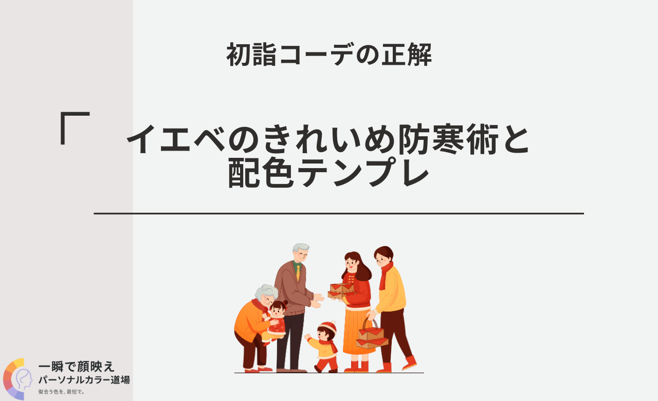 初詣のイエベ防寒は、顔まわり=生成り/バニラ+コーラル/アプリコット/テラコッタ、外縁=キャメル/チョコ/ディープオリーブ、素材はマット×微ツヤ。薄×薄×厚の三層と前開き一枚で温度調整すれば、行列もご祈祷も写真も安心です。家族リンクも生成りを共通にすれば一体感は即完成。新年最初の一枚を、あたたかく上品に。