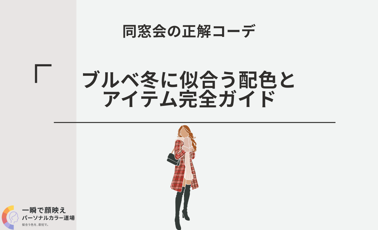 同窓会のブルベ冬は、上に最明色、胴体に締めの深色、小物に冷たい金属と一滴の鮮やかさ。