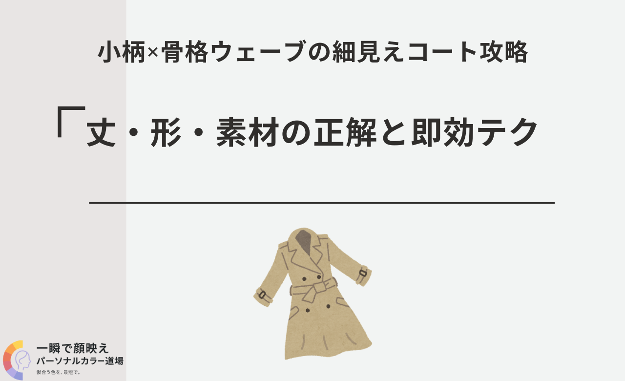 小柄×骨格ウェーブのコートは、太もも上〜ひざ上の丈、細い襟、高めボタン、薄〜中薄の落ち感生地が鉄則。小ぶりバッグ・甲浅靴・細ベルトで重心を上に集めれば、通勤も休日も行事も華奢見え・脚長・きちんとが安定します。
