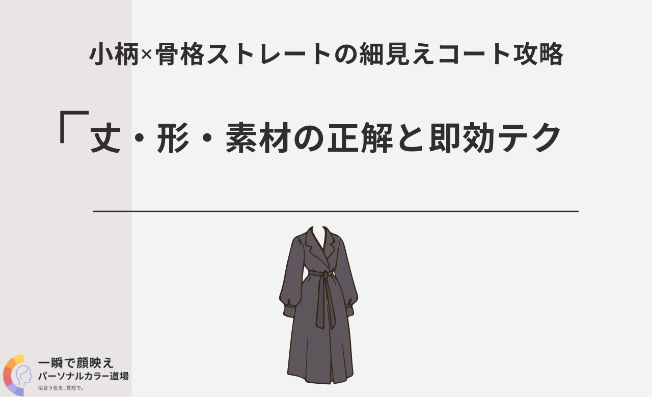 小柄で骨格ストレートだと、コート選びが毎年むずかしい――「ロングは飲み込まれる」「ショートは子どもっぽい」「厚手は横に広がる」。原因は、上半身が直線的で厚みがある骨格ストレートに対し、丈・肩線・前合わせ・生地の厚みが噛み合っていないからです。