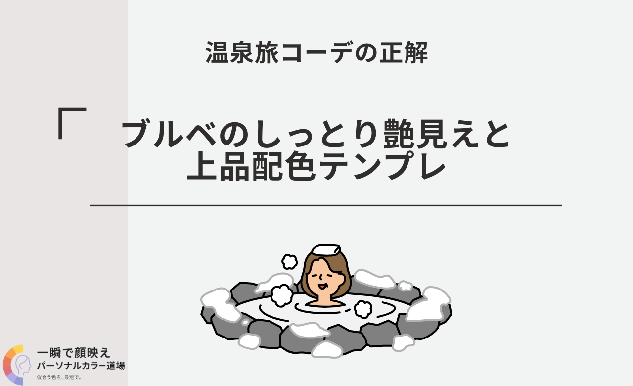 温泉旅は、客室でくつろぐ時間、館内の移動、外湯めぐり、食事処、夜の露天、朝の散歩……と灯りと背景が次々変化する一方で、荷物はできるだけ軽く少なくしたい旅。楽を優先すると部屋着っぽく見え、きちんと寄せると湯上がりとの温度差で浮きがち——そんな“温泉あるある”を**ブルベ(青みが似合う人)**目線で丸ごと解決します。