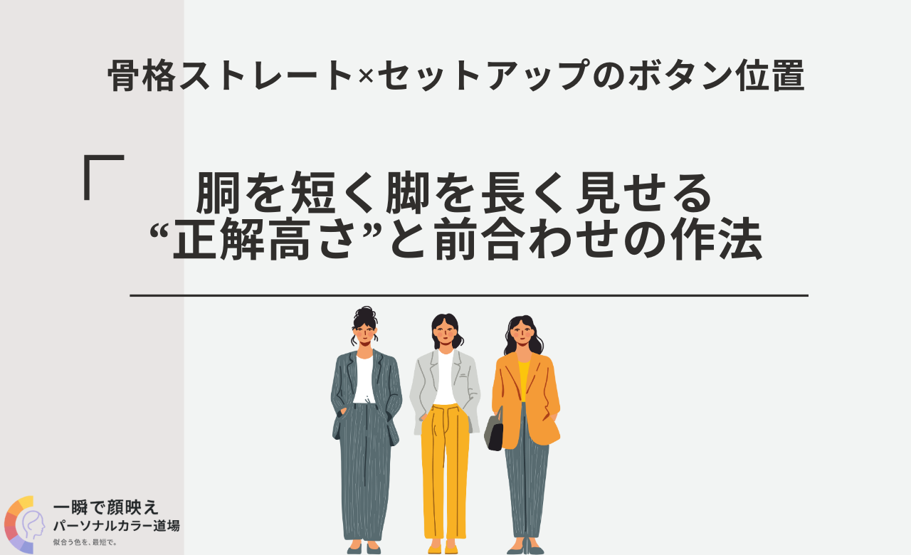 骨格ストレートは胸郭が立体的で腰高に見えやすく、正面からの面積が大きく写ります。ボタンが低いと視線が腹部中央で止まり、胴が長引きして見えます。ボタンの高さをみぞおち付近に引き上げると、視線は胸骨ラインに沿って上方へ逃げ、同時に下半身の面積が相対的に広く確保され脚長効果が現れます。視線を“上に引いてから下へ落とす”のが設計の基本です。