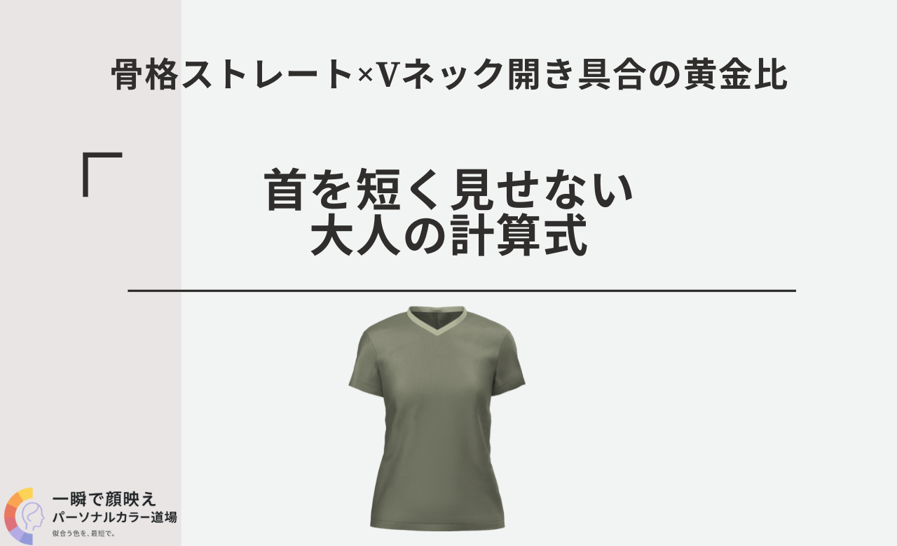 鏡の前でVネックを手に取るたびに「どこかだらしなく見える」「胸元が間延びする」「詰まって太って見える」と感じる違和感は、骨格ストレート特有の上半身の厚みと直線に、Vの深さ・幅・角度・前中心長が噛み合っていないことから生じます。