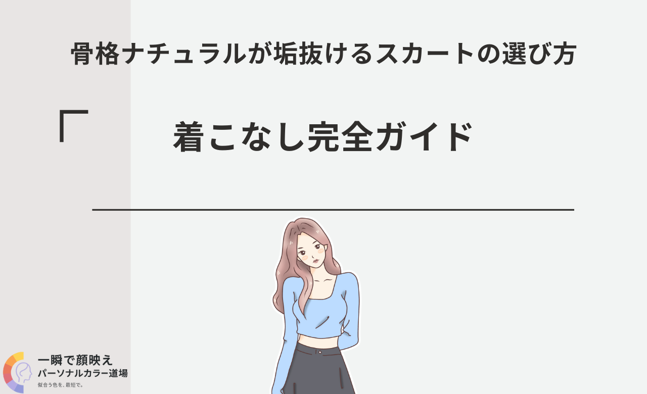 骨格ナチュラルのスカートは、中厚でハリのある生地I〜ストレート/緩フレア/小マーメイド骨盤上の自然なウエスト膝下〜足首上の丈が鉄則。比翼・小金具・玉縁で線を減らし、箱型トップス/肩線ぴったりの羽織/甲見せ靴で面をそろえれば、通勤も休日も行事も端正・縦長・大人の余白が安定して手に入ります。