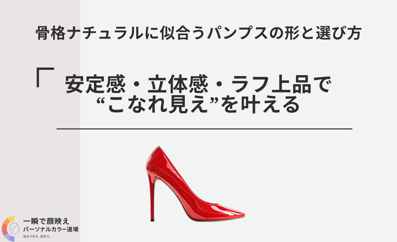 骨格ナチュラルのパンプス選びは、中厚素材で面の上質を作り、甲はやや深め、つま先はアーモンド〜緩スクエア、ヒールは3.5〜5.5cmの太めに寄せるだけで一気に整います。数値で確認→形で最適化→場面で置換→悩みで微調整——この段取りを身につければ、朝の判断は数十秒。今日の一足が、あなたの“ラフ上品”を標準化します。