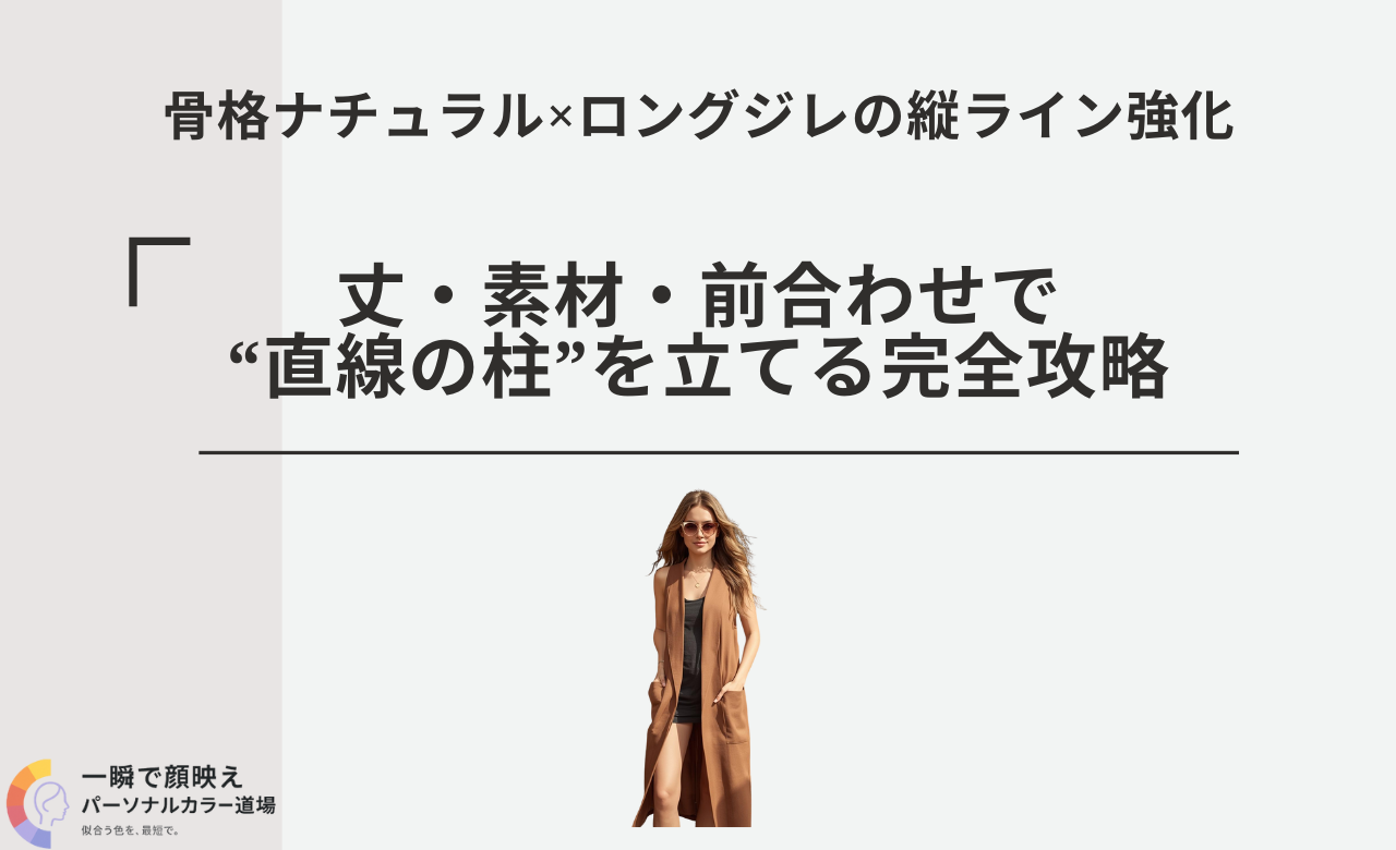 関節や骨のフレーム感が強く、服の面積が増えるほど“着られている”印象になりやすい骨格ナチュラル。ロングジレは本来、その“余白”を一本の縦柱で整える最強の武器ですが、丈が曖昧、前立てが太い、素材が重い——この三つが重なると体の凹凸が粗く拡大されてしまいます。