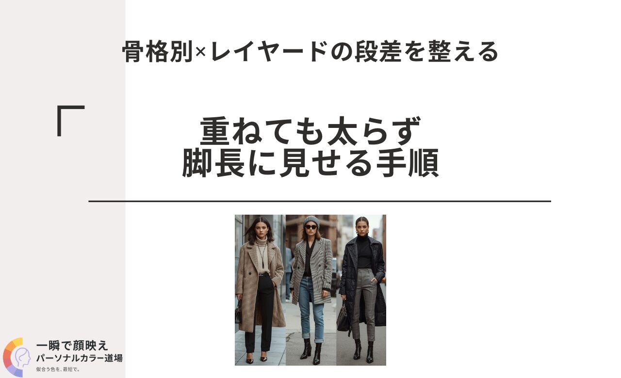 この記事ではまず、なぜ段差があると太って見えるのかという原理を整理し、次に骨格別に「ここに段差を置けば安全」という高さと丈感、さらにシャツ・ニット・ベスト・ワンピース・アウターといったアイテム別の組み方、外出や在宅などシーンをまたいでも崩れない重ね順、最後にQ&Aと用語辞典で細部を補います。今日からのレイヤードを一気に“整って見える重ね方”に上書きしてください。