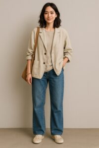 骨格ストレートは、ジャストサイズのトップスやウエスト位置が高すぎないボトムス、縦のラインを強調したIラインシルエットが得意です。Vネックやシャツ襟など、デコルテをすっきり見せるデザインを選ぶと、上半身の立体感がきれいな「大人のきちんと感」に変わります。