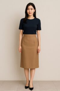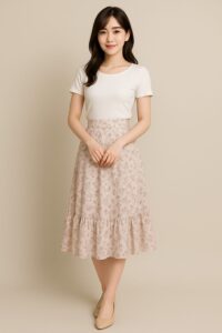骨格ウェーブは、ハイウエストのスカートやパンツ、フィット&フレアのワンピースなど「ウエスト位置を高く見せる」デザインが得意です。軽やかな素材や、細かいフリル・ギャザー・小さめの柄を取り入れると、もともとの華やかさが上品に引き立ちます。