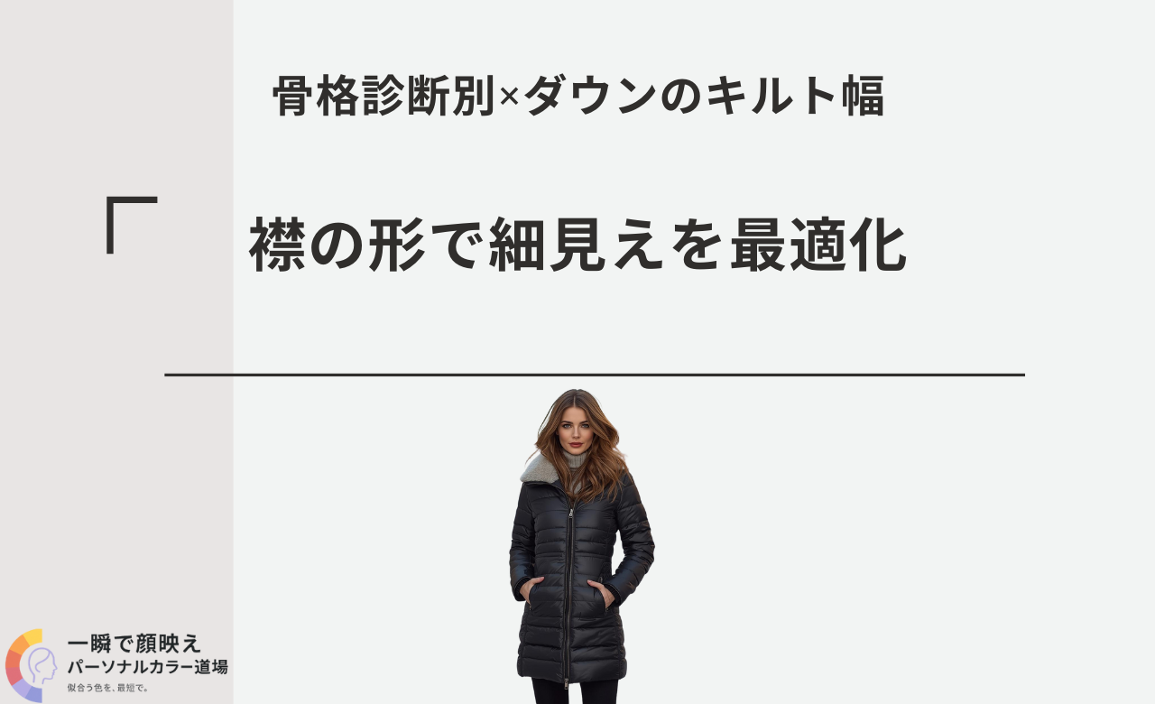 冬の主役アウターであるダウンは頼もしい一方、膨らみ・首まわりの抜け不足・顔の大き見えで損をしがちです。失敗の多くは、体の骨格バランスに対してキルト幅(ステッチ間の面積)と襟の立ち上がり・開き角度・前立ての太さが噛み合っていないことから生まれます。